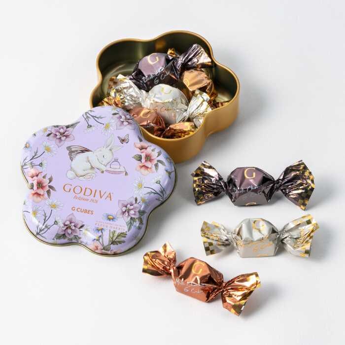 さらに、「羽ばたく花咲く春Gキューブアソートメントフラワー缶7粒入」は、妖精の羽をひらめかせ春の花々に囲まれたうさぎを描いたフラワー形の缶に3種類7粒のGキューブを詰め合わせ、価格は1,782円です。