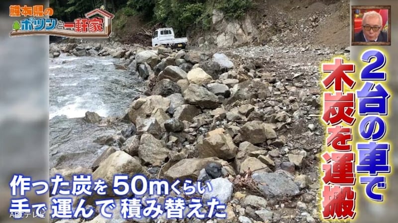 男性はこの家で、35年間、炭焼きをして生計を立てている。窯の中で3日ほどかけて木を組み、800度で2日半焚き上げると熱分解による炭化(たんか)が始まる。着火後4~5日かけて炭化を進行させ、冬場は5日ほどかけて自然冷却する。出来上がった炭は、焼き鳥の専門店やバーベキュー用として販売。年間15トンもの炭を作る。仮設住宅で暮らしていたときも炭を焼き続け、分断された道路を2台の車に積み替えて炭を運んだ。
