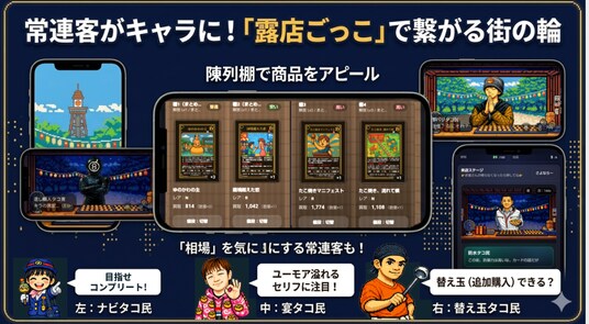 実際の常連客をモデルにしたキャラクター「タコ民」が住民として登場。自分の露店でカードを販売する“店主体験”が楽しめます。