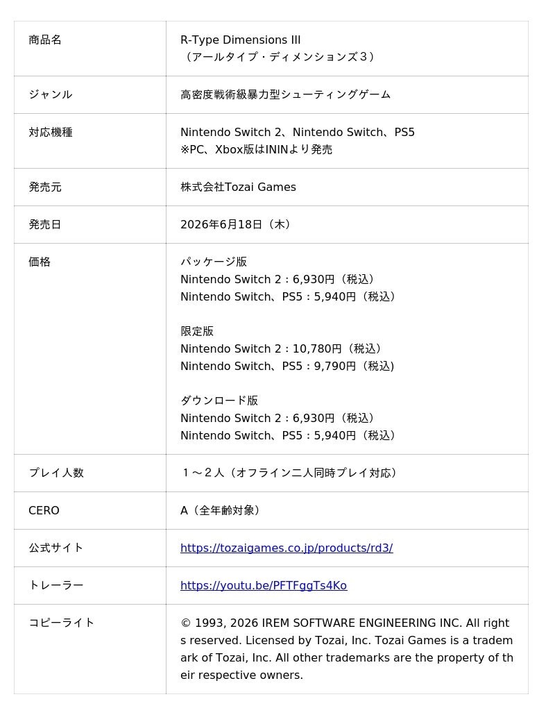 株式会社Tozai Games (神奈川県川崎市、代表取締役: 坂野 拓也、以下、Tozai Games)は、 「R-Type Dimensions III(アールタイプ・ディメンションズ3)」のパッケージ版、限定版、ダウンロード版をNintendo Switch 2、Nintendo Switch およびPlayStation 5向けに2026年6月18日に発売することを発表致しました。パッケージ版と限定版は2026年3月12日より予約の受付を開始致します。