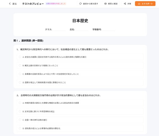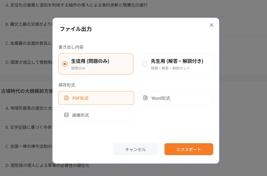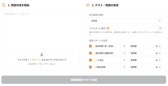 問題形式(選択式・穴埋め・○×など)や出力言語、設問数を自由に設定。ニーズに合わせた柔軟なカスタマイズが可能。