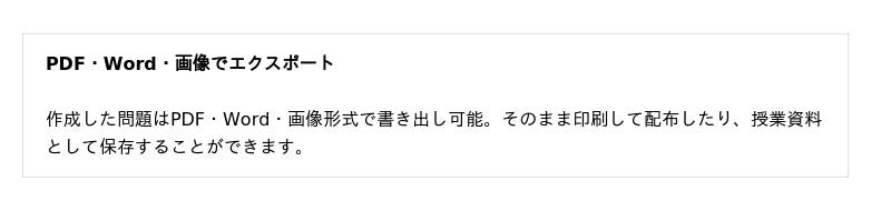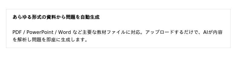 ・ 教材・講義資料の活用 -- 講義資料をそのまま問題バンクへ変換し、知識定着を促進