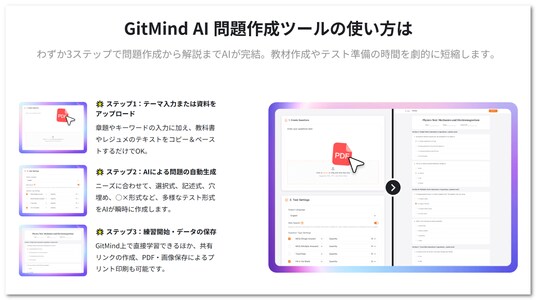 GitMindは、こうした教育現場のペインポイントを解決するため、AIを活用した問題作成ツールを開発。資料をアップロードするだけで、AIが内容を解析し、即座に学習効果の高い問題セットを生成する仕組みを実現した。
