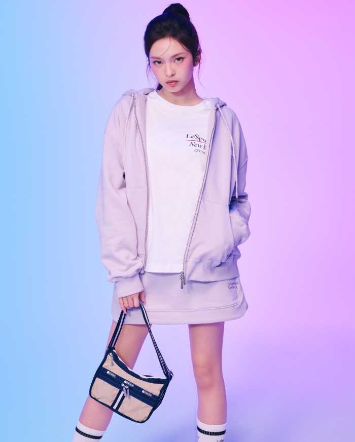 スモールエヴリデイバッグ(スペクテイターボーン/ネイビー)13,750円※3月18日発売予定、スウェットフーディー(ラベンダー)23,100円、プリントロングスリーブプルオーバー(ホワイト)13,200円、スウェットミニスカート(ラベンダー)15,400円、レスポートサックNYソックス(ブラック)2,970円を着用しています。