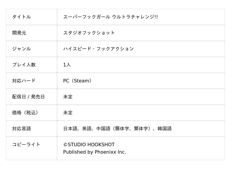 株式会社Phoenixx(フィーニックス)(東京都武蔵野市、代表取締役社長:坂本 和則)は、ゲーム制作サークル「スタジオフックショット」が手掛けるハイスピード・2Dフックアクション『スーパーフックガール ウルトラチャレンジ!!』のパブリッシングを決定いたしました。あわせて、本日より本作の公式ホームページおよび最新PVを公開したことをお知らせいたします。