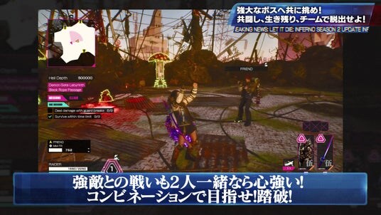 PlayStation(TM) StoreとSteam(R)にて、期間限定セールを実施します。シーズン2が開始したこのタイミングに、お得に『LET IT DIE: INFERNO』をご購入いただけます。地獄門でのレイダー活動を開始するのに絶好のプレイチャンスを、どうぞお見逃しなく。
