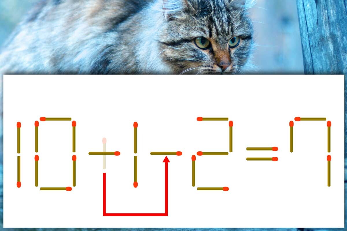「+」のマッチ棒を1本、「1」と「2」の間に移動させて「-」を作り、「10-1-2=7」にする。※解答は複数ある場合があります。