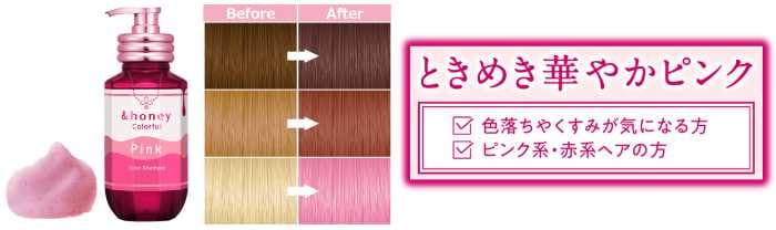 展開されるのは3色。アンドハニー カラフル カラーシャンプー チェリーピンクは、やわらかく華やかなピンクカラーを保ちたい方におすすめ。