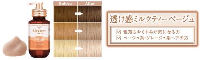 アンドハニー カラフル カラーシャンプー ミルクティーベージュは、トレンド感のあるベージュ系カラーをきれいにキープします。