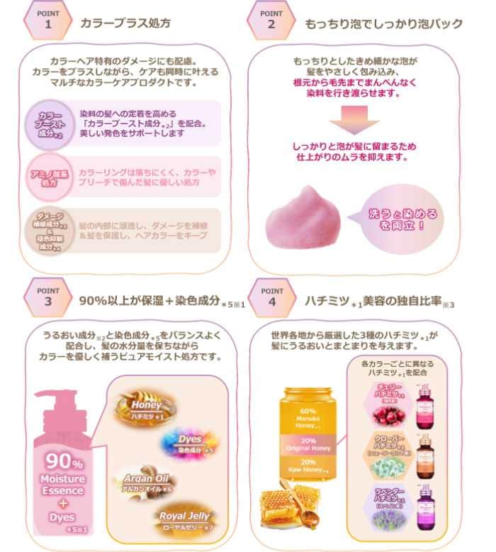 そこで誕生したのが「&honey Colorful」。カラーをプラスする染色成分に加え、アンドハニーの特徴であるハチミツ*1の保水力に着目し、ダメージ補修や褪色抑制成分を配合しています。