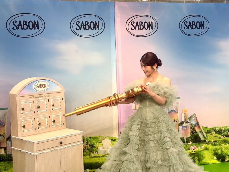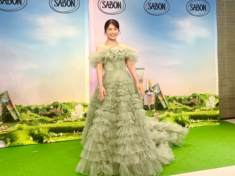そして、タレント・俳優の渋谷凪咲さんが登壇。「ホワイトティー・セレブレーション」の世界観をイメージした“春の女神”のようなロングドレスを着用して現れ、その美しさに会場からも感嘆の声があがりました。