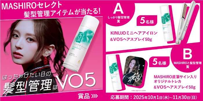 期間中、VO5公式Xアカウントをフォローし、キャンペーン投稿を引用リポストするだけで応募完了。抽選で「髪型管理」応援アイテムが当たります。応募期間は10月1日(水)~11月30日(日)まで。