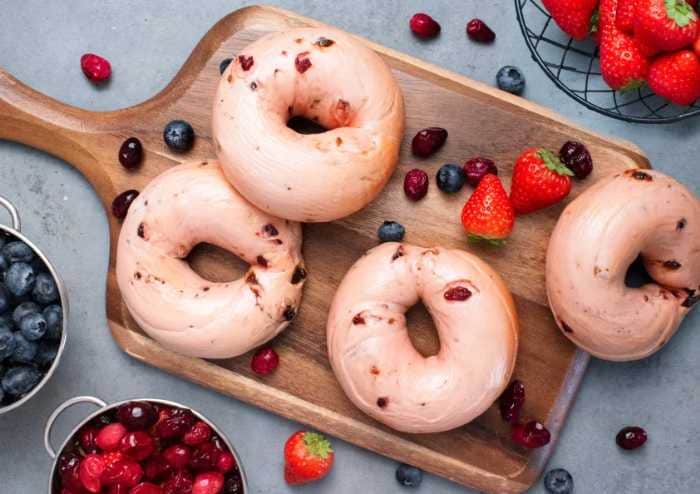 「トリプルベリー」は、ストロベリー、クランベリー、ブルーベリーの3種類のベリーをごろっと生地に練り込んだベーグル。