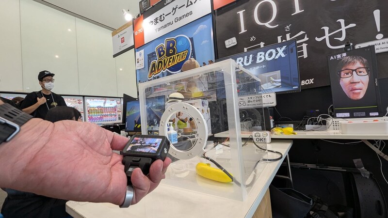 磁気ストラップを使ったハンズフリー撮影も試してみました。箱の中のバナナを“取り出せない動作”を再現することで積極的にIQを“下げに行く”体感ゲーム「SARU BOX」を撮影してみたのですが……。