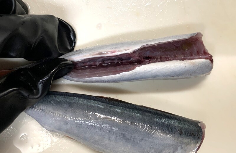 ②ひっくり返して反対側から背骨に沿って刃を入れ、背骨をとります。