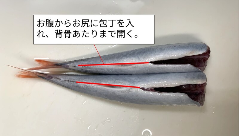 ①(内臓を取ってから)お腹からお尻あたりに包丁を入れ、背骨にあたるまで開きます。