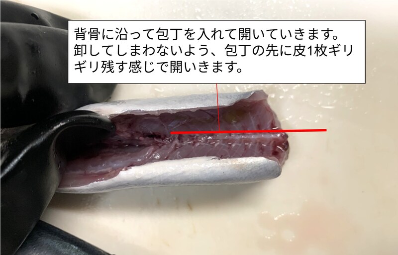 ②背骨に沿って刃を入れて開きます。このとき卸してしまわないよう注意です。