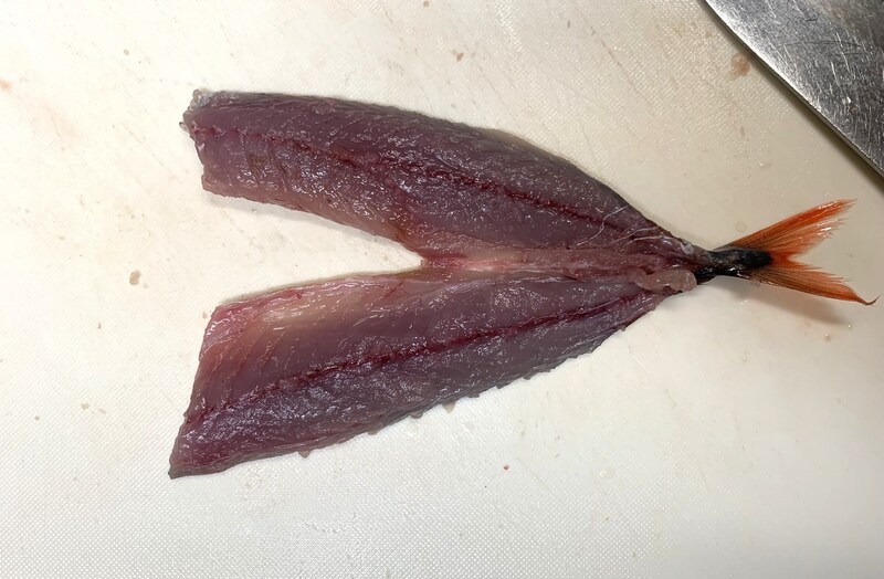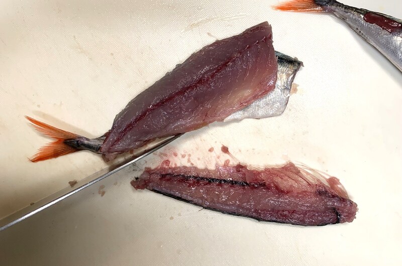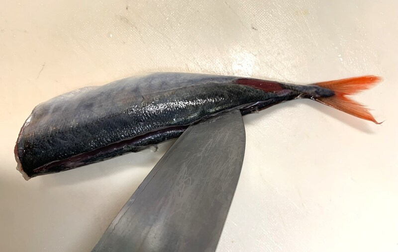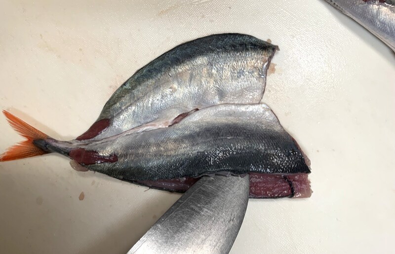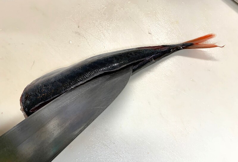包丁の先に皮1枚ほどギリギリ残るように気を付けながら、尻尾まで刃を滑らせて開いてきます。