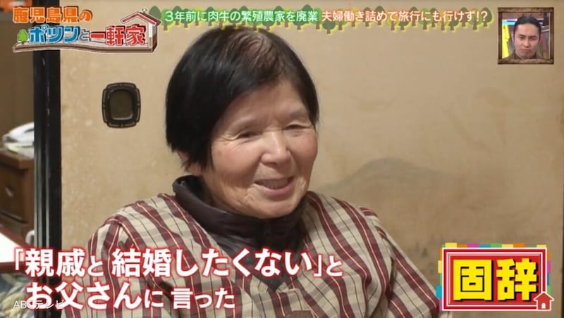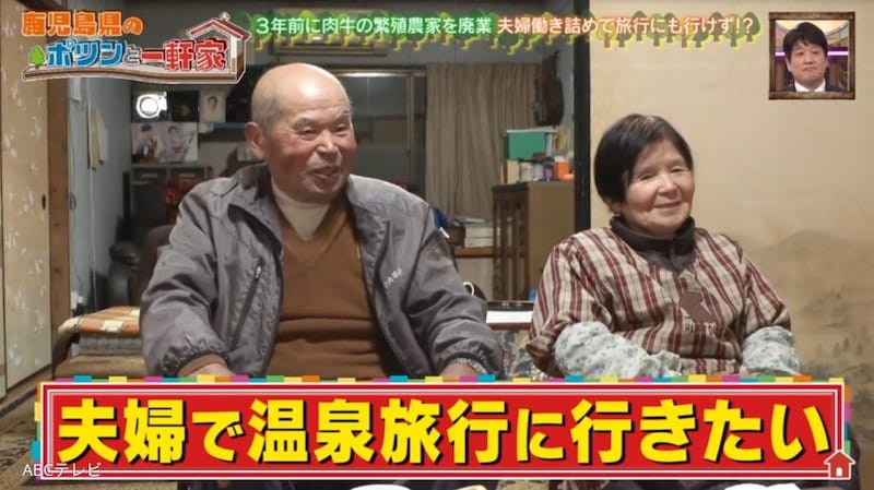 妻は隣の集落の出身。農家の8人兄妹の7番目で、病弱な母に代わり高校には行かずに家事を担った。20歳で、7歳年上の従兄妹であるご主人に嫁いだ。「親戚と結婚したくない」と断ったものの、親に逆らえず結婚。結婚式も挙げず、新婚旅行もなし。「牛がいたから旅行にも行ったことがない」そう。「子供はいなかった」けれど「2人で一生暮らそうと思って。苦労した分もあったけど、2人でなんとかやってきた」というご夫婦の夢は、温泉旅行。結婚して63年。牛の世話に追われ、1度も叶わなかった温泉旅行。桜島を眺めながらのんびり浸かる日が待ち遠しい。