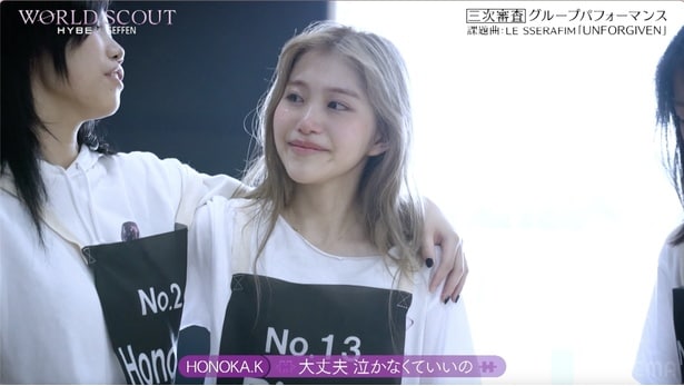 また、HONOKA.Mも、「この2週間、このチームでできてよかったし私はアイドルという夢を諦めたくない」と語り、過去にオーディション番組に参加したことのあるHONOKA.Kも「何回ももうやらないって決めていたけど、結局人に自分の歌を聴いてもらいたいって思う、誰かの支えになれる人になりたい。合格して最後の1人に選ばれたい」と涙ながらに語った。