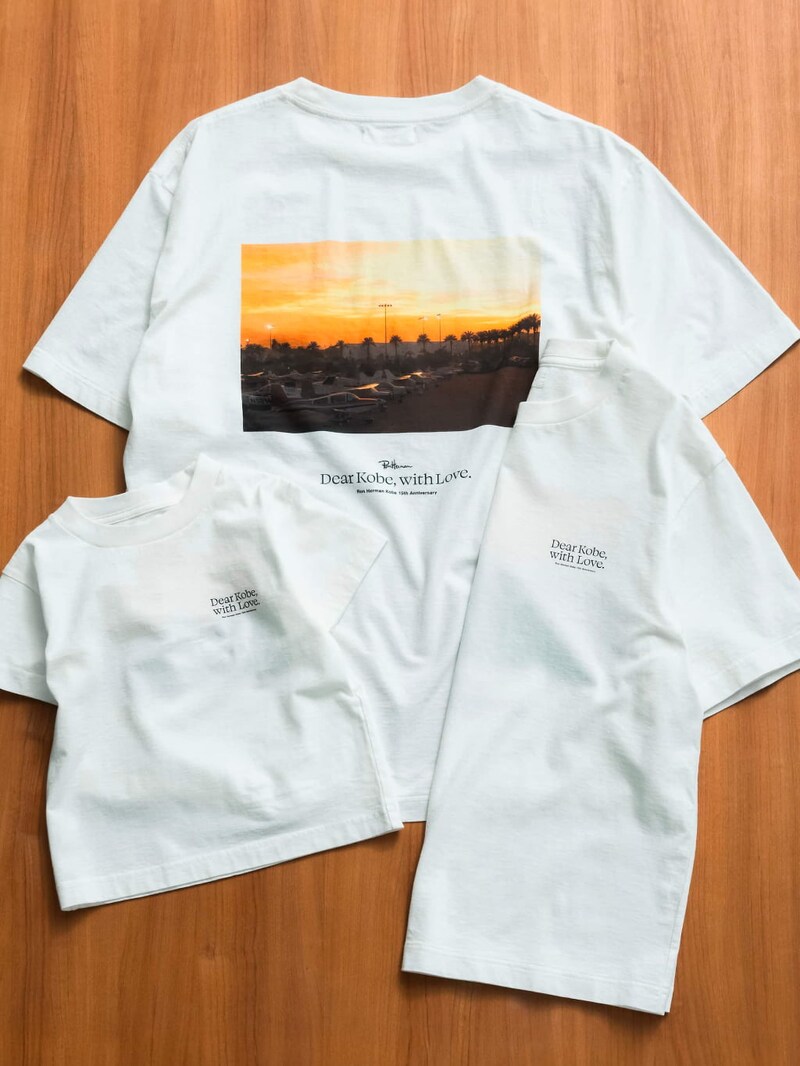 オリジナルのアニバーサリーアイテムは、神戸店オープンの際に使用した広告写真に、“Dear KOBE with LOVE”のメッセージを添えたプリントTシャツ。家族でおそろいにできるサイズ展開です。
