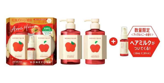 乾燥や静電気で広がりやすい冬の髪に、数量限定の「ハニーク」ヘアケアキットが登場。シャンプー・トリートメント・ミニサイズの2WAYヘアミルクを組み合わせたセットで、うねりやパサつきにアプローチします。ハチミツとうねりケアケラチン¹を2倍²配合した「ハニープロテイン処方³」により毛先までしっとりまとまり、甘くみずみずしいアップルハニーの香りで冬のヘアケアタイムを楽しめます♡