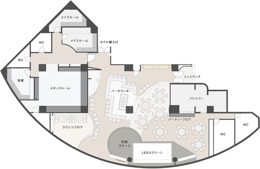 会場全体フロアマップ(会場総面積:約600平方メートル 収容人数:着席約100名/立席約150名)