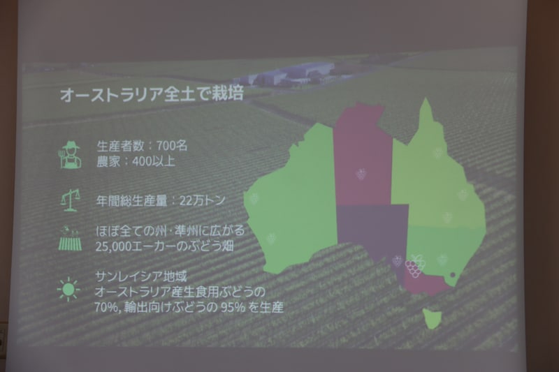「オーストラリアでは、ぶどう生産者は約700名、ぶどう農家の数は400件以上です。毎年22万トンの生産量となっており、ぶどう畑の面積は2万5000エーカー(約101平方キロメートル、東京ドームで約2,166個分に相当)で、ほぼ全ての州と準州に広がっています。」
