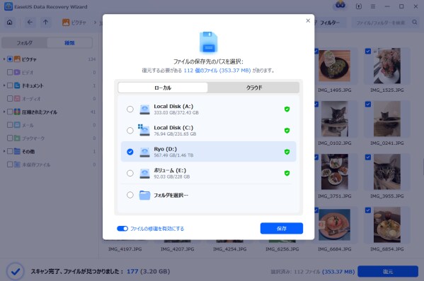 ステップ3.必要なファイルを選択したら、「復元」ボタンをクリックします。復元先の保存場所を指定する画面が表示されるので、元のSDカード以外の場所を選ぶようにしましょう。保存したら、メモリーカードの復元作業が終わります。