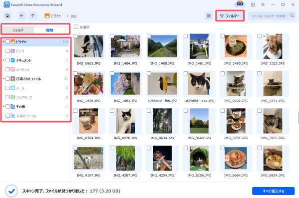 ステップ2.スキャンが完了すると、見つかったファイルの一覧が表示されます。復元したいファイルにチェックを入れましょう。「フォルダ」タブや「種類」タブを使えば、ファイルを保存場所やファイル形式で分類表示できるので、目的のデータを探すのが簡単になります。「フィルター」機能を使えば、ファイルの種類、更新日時、サイズなどでさらに絞り込むことが可能です。