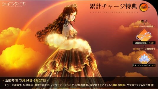 キャンペーン期間中、累計チャージ額が指定値に達すると、SSRセットコーデ「黄昏との決別」や大量の育成素材を獲得できます。