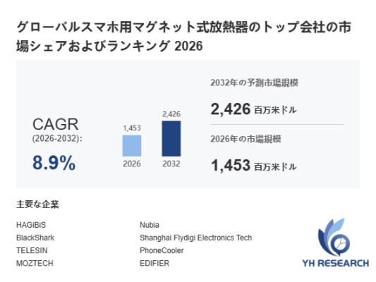 YHResearch調査チームの最新レポート「グローバルスマホ用マグネット式放熱器のトップ会社の市場シェアおよびランキング 2026」によると、2026年の1453百万米ドルから2032年には2426百万米ドルに成長し、2026年から2032年の間にCAGRは8.9%になると予測されています。