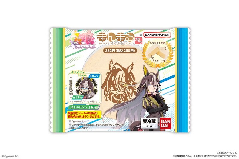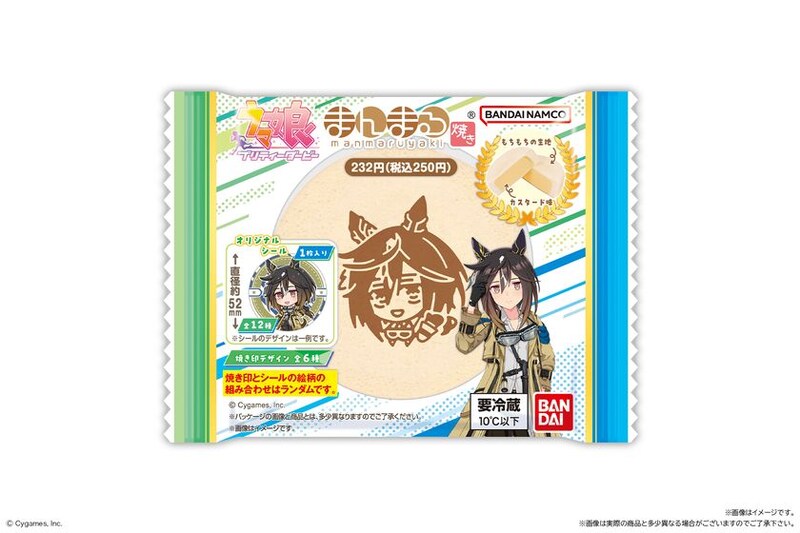 白いもちもちの今川焼きに、ゲーム『ウマ娘 プリティーダービー』に登場するキャラクターの焼き印を施したチルドスイーツです。焼き印デザインは全部で6種類。白色の生地の中には、カスタード味のクリームが入っています。