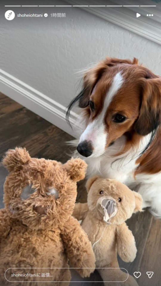 「ごめんなさい...」大谷翔平の愛犬デコピンがまたやんちゃ!? 無残に破壊された、ぬいぐるみを目の前に困り顔