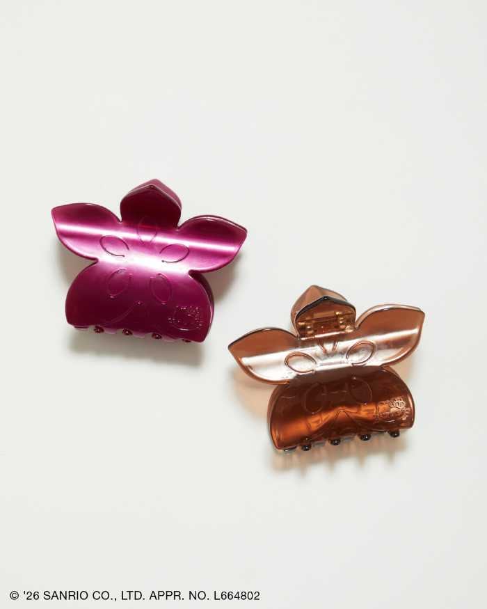 90年代ムードを感じるフラワーモチーフのヘアクリップ。右下に寝そべるハローキティのフェイスを添えたレトロガーリーなデザイン。バッグチャームとしても使えます。