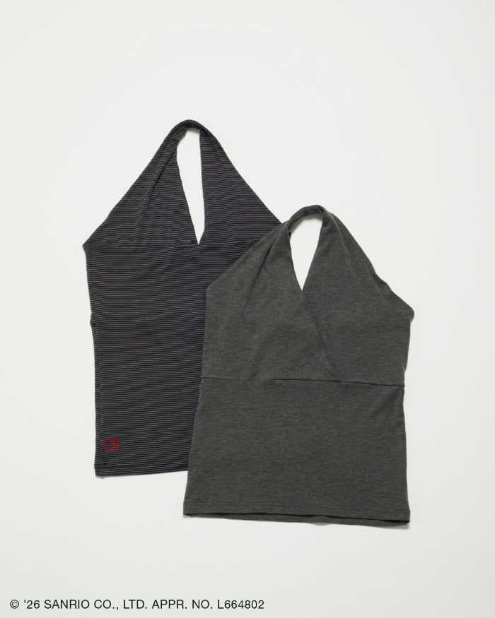 肩のラインを美しく見せるホルターネックデザイン。後ろ身頃左脇にハローキティの刺繍を施した、大人のムード漂う一着。ビスチェ風レイヤードスタイルも楽しめます。
