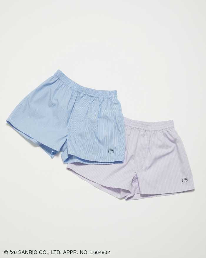 ストライプ柄のボクサーパンツにハローキティ刺繍をあしらったデザイン。デニムやスラックスのインナーとして見せる着こなしや、ルームウェアとしてもおすすめです。