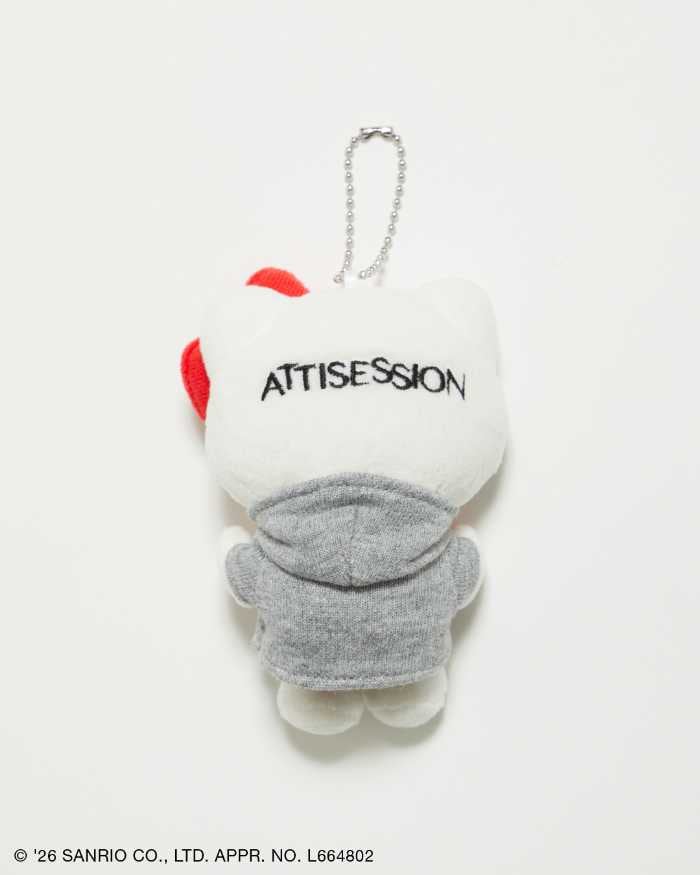 ATTISESSIONオリジナルパーカーを着たハローキティのぬいぐるみチャーム。バッグやポーチのアクセントになる特別感のあるアイテムです。