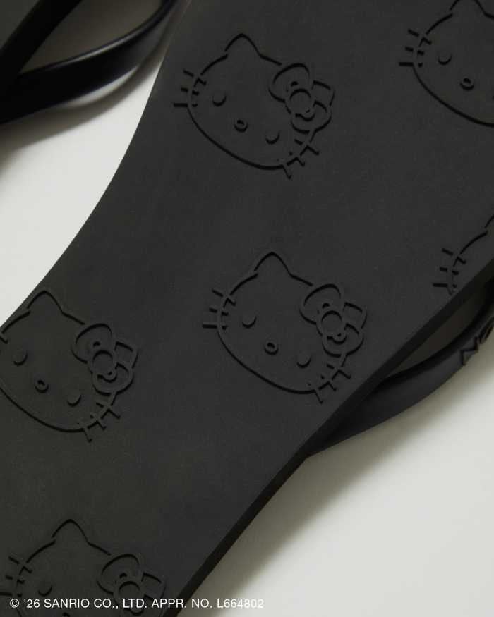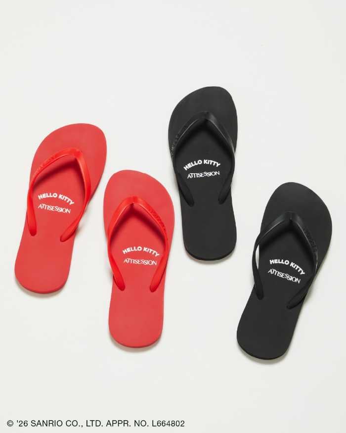 ソール裏にハローキティのフェイスモチーフをあしらい、砂浜を歩くとキティの足あとが浮かび上がるユニークなデザイン。カラーはブラック、レッドの2色展開。