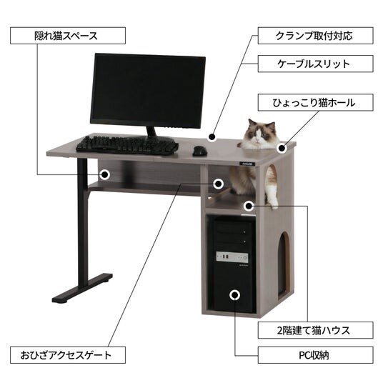 狭いところに潜り込みたいという猫の本能を誘引する<2階建て猫ハウス>&<隠れ猫スペース>を、PCデスクにドッキング。猫の専用スペースをあえて天板下に確保することで、机上のプレイ領域への侵略を防止します。猫ハウス下段はPC収納としても活用でき、ミドルタワーサイズのデスクトップパソコンをかわいい猫の魔の手から保護することが可能です。