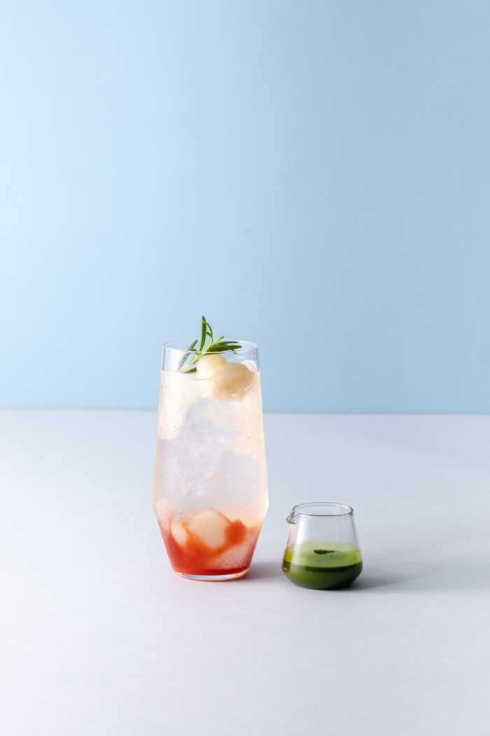 「MATCHAライチグアバソーダ」は950円(税込)。グアバシロップとソーダにライチゼリーとライチの実を合わせ、ローズマリーを飾ったトロピカルなソーダ。