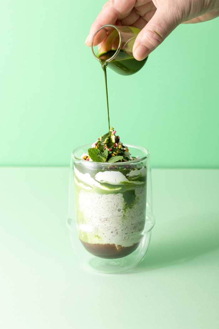 「MATCHAチョコミント」は1080円(税込)。チョコレートシロップの上にチョコミントシェイクを注ぎ、ホイップクリームと濃茶ソース、カラフルなチョコスプレッドをトッピング。