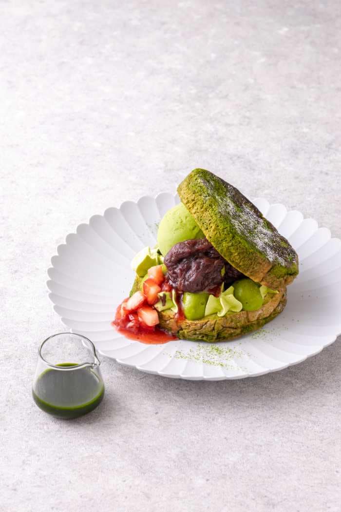 ブリオッシュ生地の丸パンにフレンチトースト液を染み込ませ、抹茶カスタード、抹茶ホイップ、抹茶ジェラート、小倉あん、季節のフルーツをたっぷり詰め込んだ贅沢な一皿です。