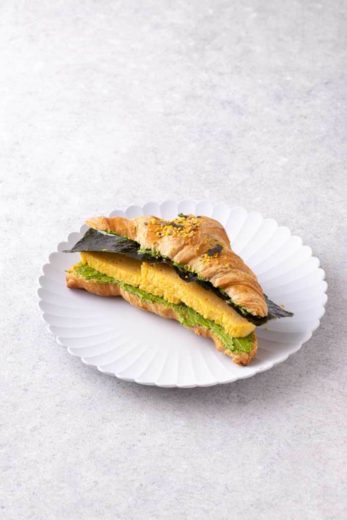 クロワッサンにだし巻き卵と焼き海苔をサンドし、抹茶ホイップバターとの組み合わせが新感覚の美味しさです。