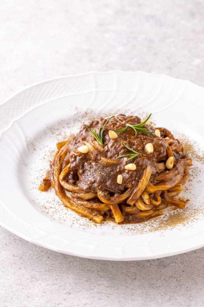 ボロネーゼソースに香ばしいほうじ茶パウダーを加えたパスタ風うどんで、ローズマリーと松の実がアクセントになっています。
