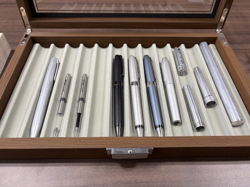 特にペン上部の波紋模様は1本あたり1時間以上かけて切削し、彫刻のような造形美を追求。