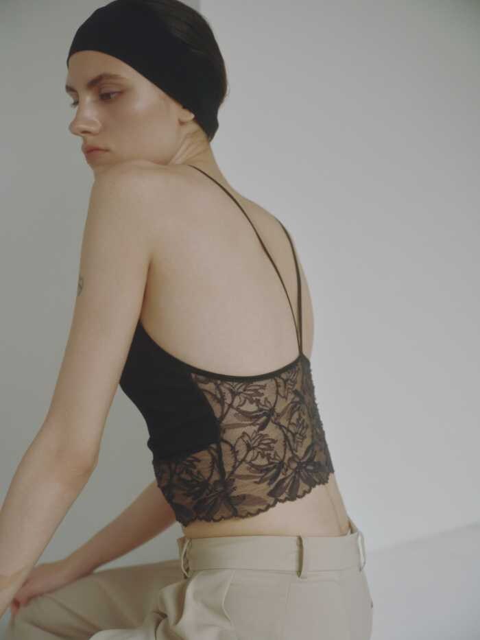 モードなブラックと鮮やかなシアンブルーの2色展開で、イタリア製の上質な生地が心地よくフィット。チュールやクロスバックのディテールが、美しいシルエットを引き立てます。