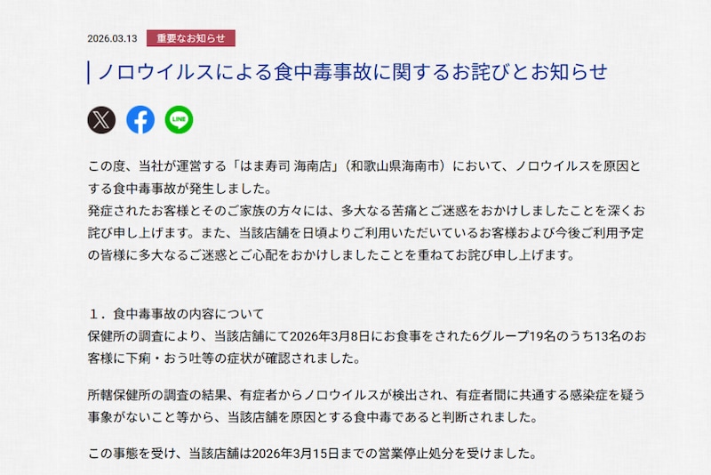 はま寿司は、ホームページで「発症されたお客様とそのご家族の方々には、多大なる苦痛とご迷惑をおかけしましたことを深くお詫び申し上げます」と謝罪。