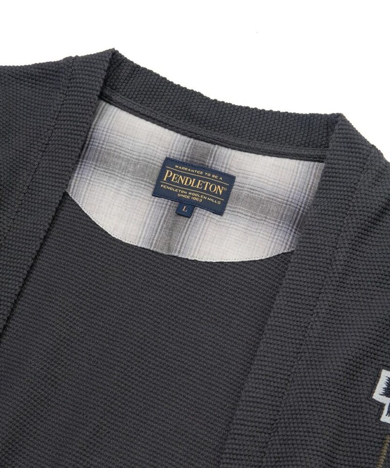 素材には程よい凹凸感が特徴の鹿の子生地を採用。天然素材ならではの柔らかな肌触りと通気性の良さで、ロングシーズン快適に着用できる。胸元にはPENDLETONらしいネイティブ柄の刺繍を配置し、シンプルなデザインのアクセントに。さらに背裏にはブランドを象徴するチェック生地をあしらい、着脱時にも特別感を感じられる仕様に仕上げている。