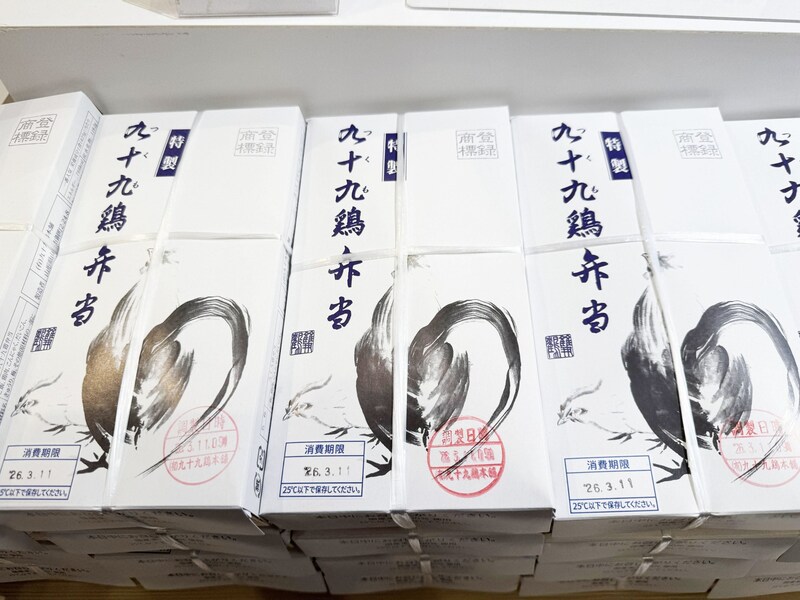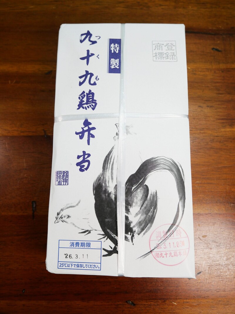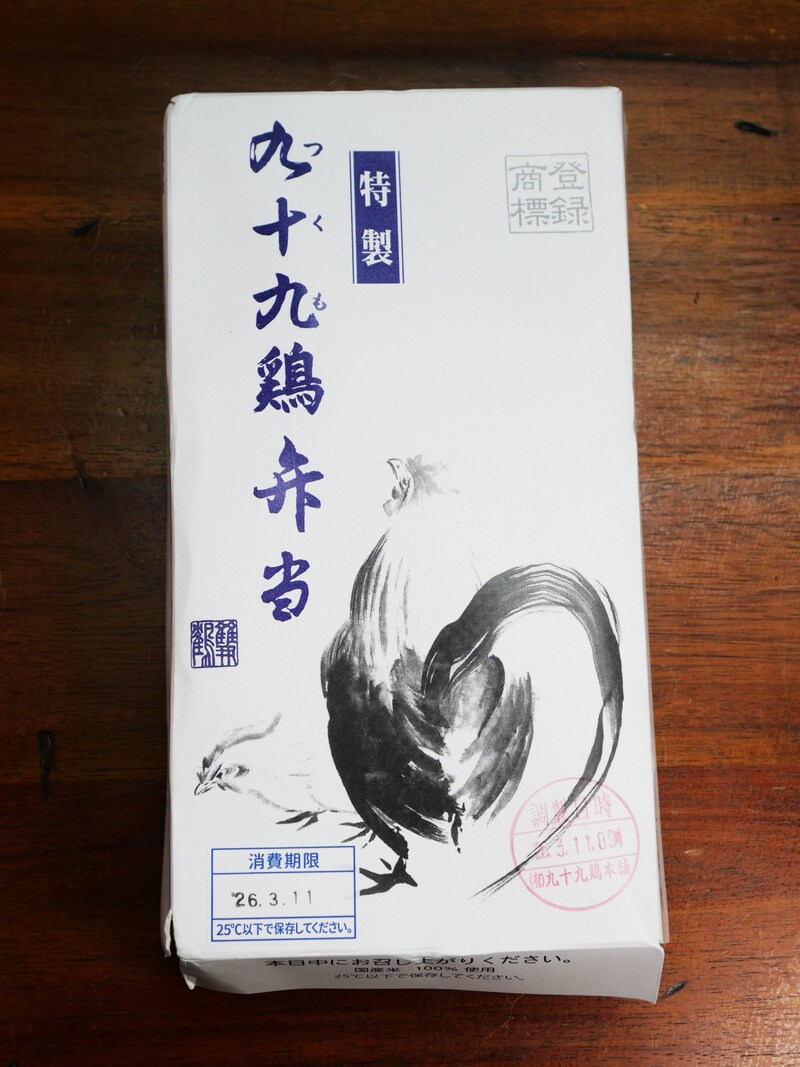 九十九鶏弁当には、具の内容によって複数の種類がある。九十九鶏弁当、鶏肉の巻物入り九十九鶏弁当、九十九鶏弁当極上。ほかにも、良質な酒粕に新鮮な若鶏を漬けた酒粕漬・九十九鶏漬や、九十九鶏のそぼろ煮も販売している。今回筆者は、鶏肉の巻物入り九十九鶏弁当を買った。鶏肉の巻物入り、つまりチキンロール入りである。